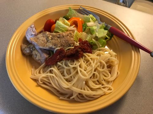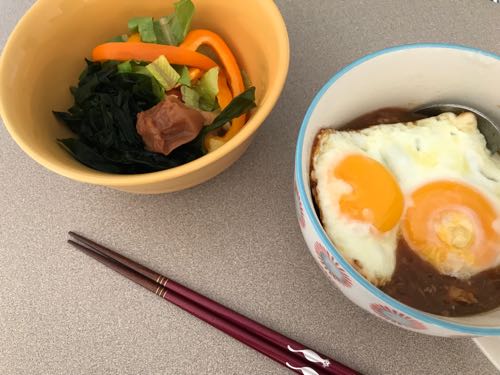 昨日のブランチは、ターキーカレー+たまごと、サラダ。