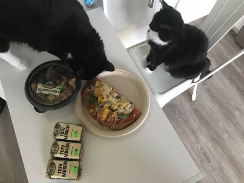 夫は豆腐むすび3つ(1つ99セント)。わたしはキヌアと野菜の丼(1.99セント)。あとグルテンフリーのヴィーガンピザがハーフカットで4ドルだったので買ってきました。夫と半分こ。