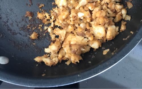 ちなみにキャットフィッシュは、スパイスべったりのまわりは美味しかったんだけど、中が「うげー」って味だったので、フライパンに戻して、フレーク状に。焦がし醤油も加えてさらに香り付け!