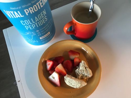 それからコーヒータイム。なんか飲んでばかりだけども!フレーバーコーヒーを淹れて、コラーゲンペプチドを足してタンパク質を手軽に補給。
