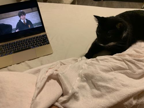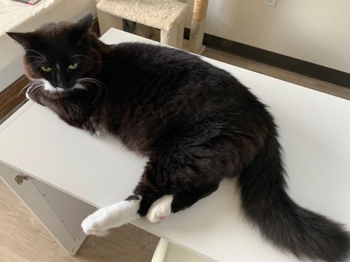 どうやら部屋の真ん中から全部が見渡せるのにハマったらしい。ベッドの足側なので、顔に落ちてくることもないからね!(以前、ベッドの横に置いてて、顔にどんっ!って着地されたことある)
