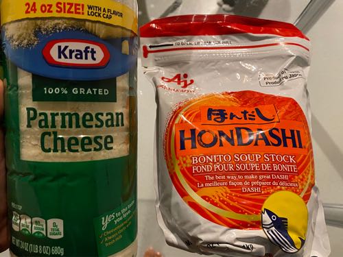 でっかい粉チーズに、ほんだし。ほんだし、一年分くらいありそう。