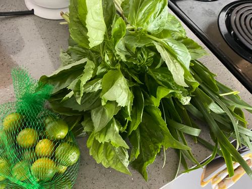 買ってきたのは、ニラとタイバジルとカラマンシーライム。どれも1ドル!