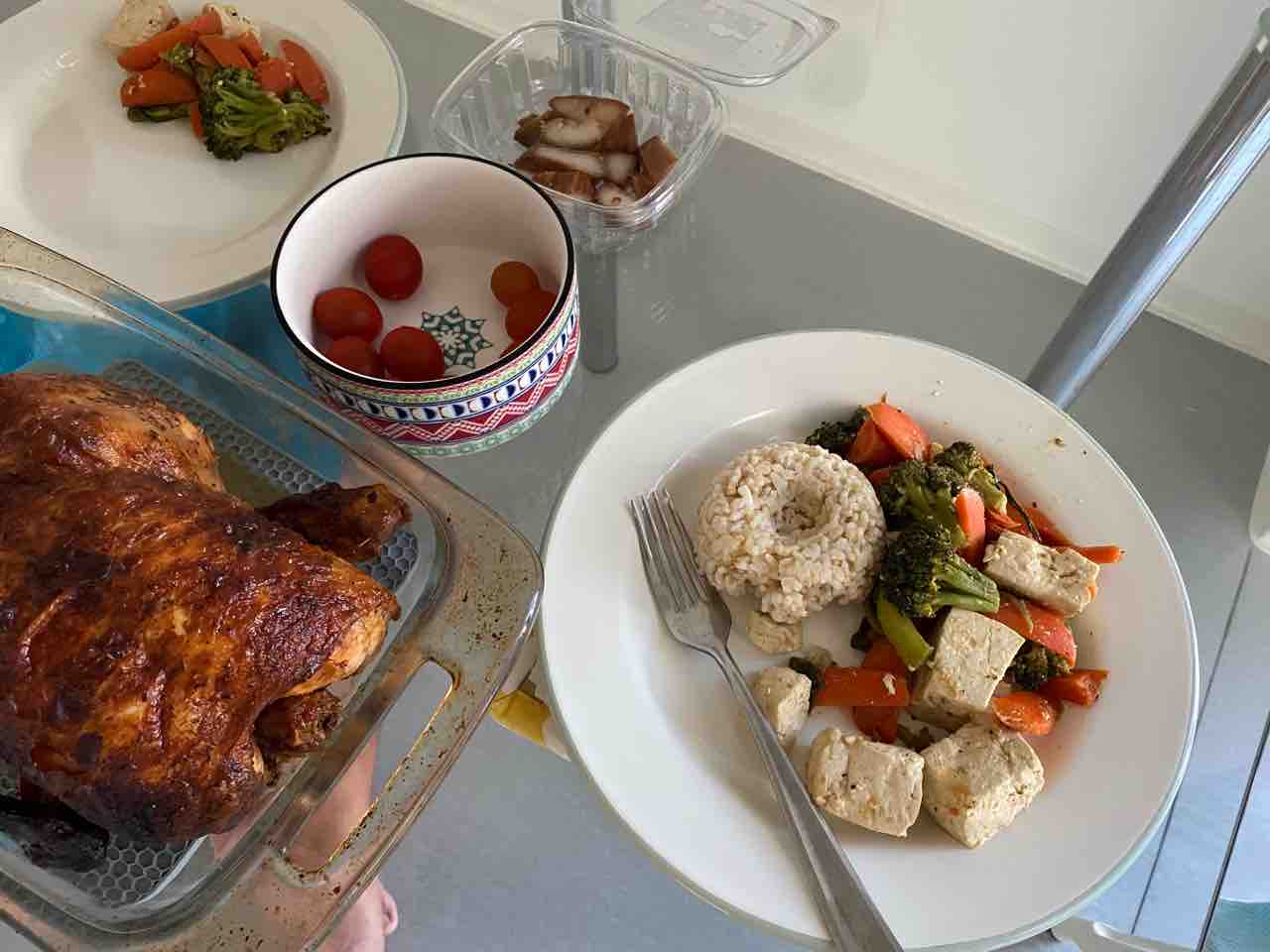 わたしは豆腐と野菜炒めに玄米。野菜炒めは、何か味が決まらなくてグリーンカレーペースト入れたらグッと美味しくなりました☺️