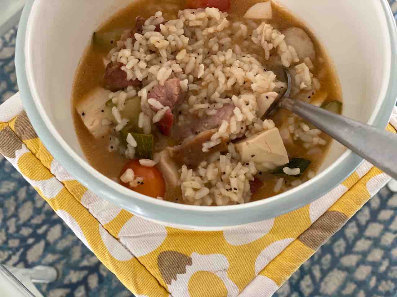 朝ごはんは、残っていたスープにごはんとベーコンを足して〜