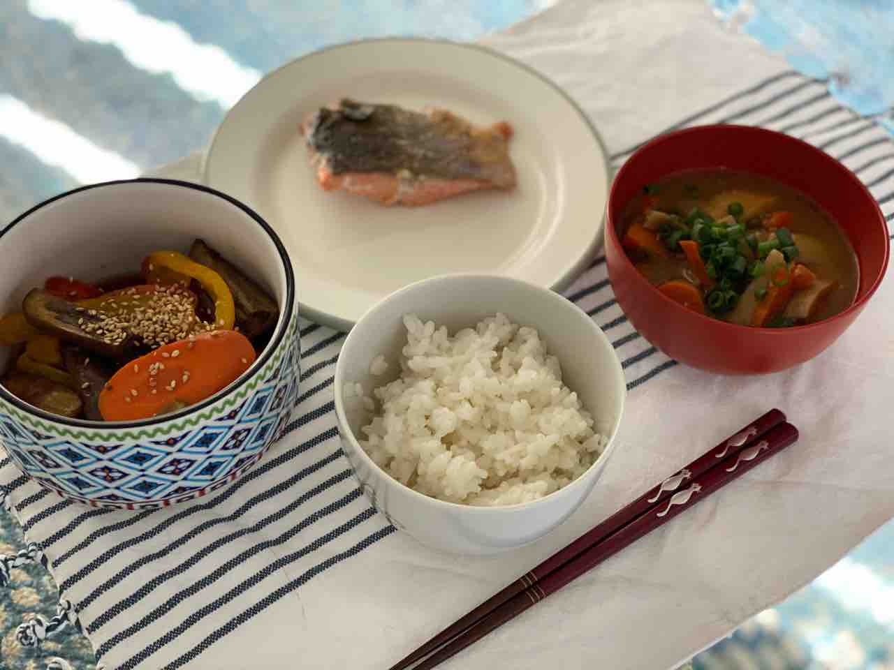 日本米炊いて、味噌汁に、焼き鮭〜😆