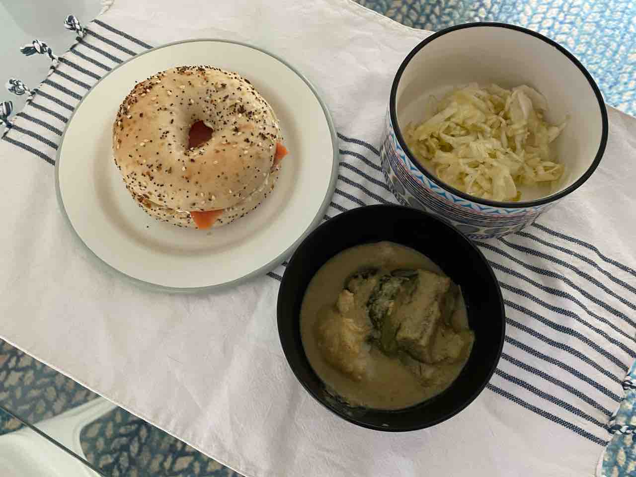 朝ごはんは、スモークサーモンとクリームチーズのベーグルサンドに、イエローカレーと、ザワークラウトというまとまりのないメニューでした😆