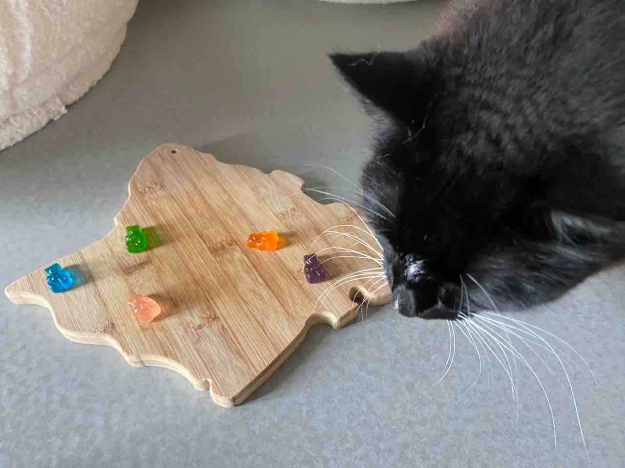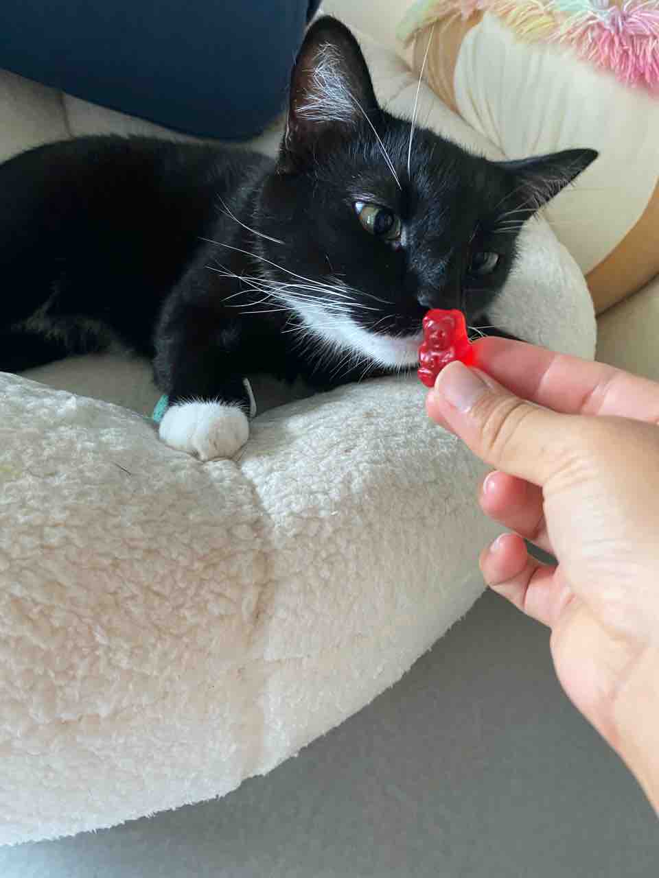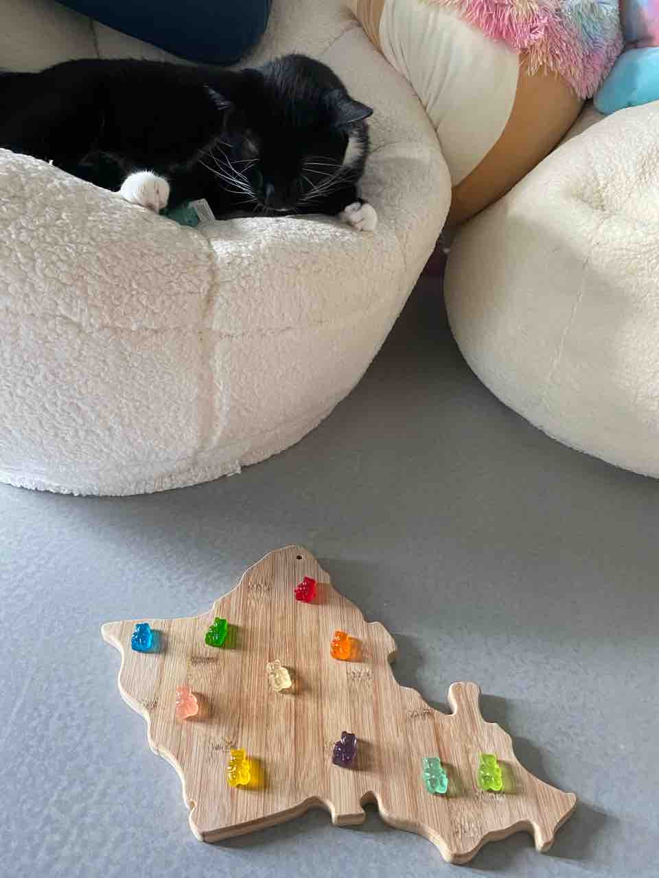寝てるたまさんの前で、グミベアを並べ始めたところ、興味津々。