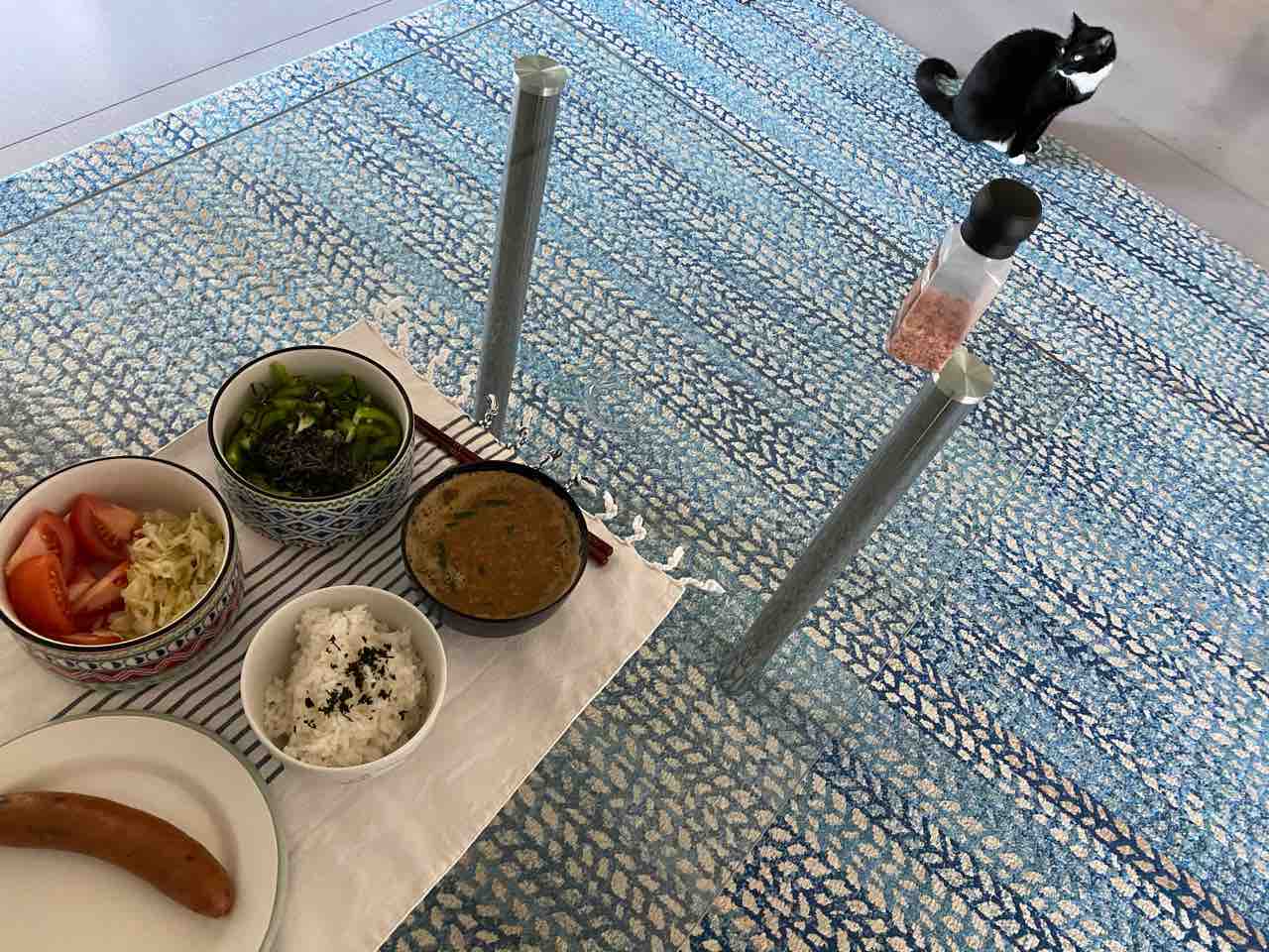 今日のブランチは、昨日の韓国納豆汁の残りと、ご飯、マンゴーポークソーセージ、トマトとザワークラウト、ピーマンサラダ!