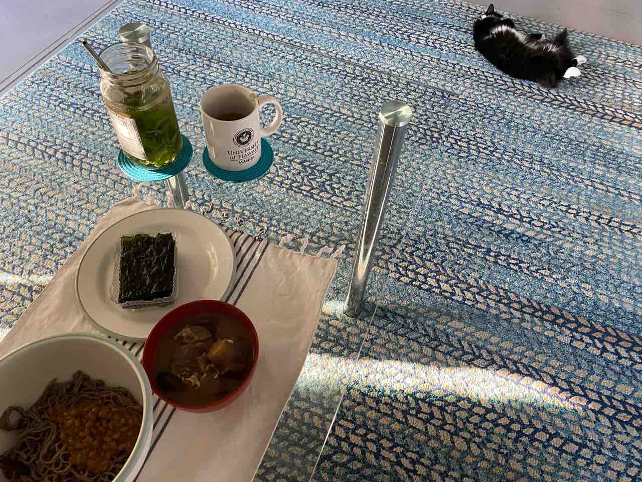 この前茹ですぎた蕎麦で納豆そばと、茄子の味噌汁の卵落とし、韓国海苔。