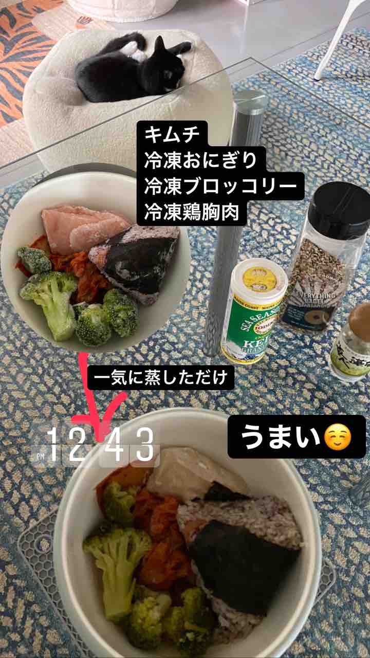 電鍋メシ。キムチと冷凍のあれこれ全部一気に器に入れて蒸しただけ。