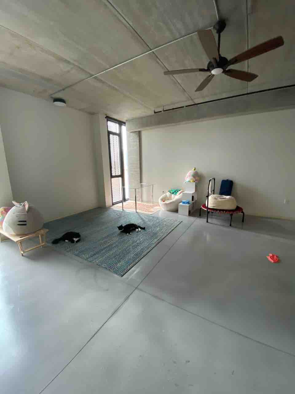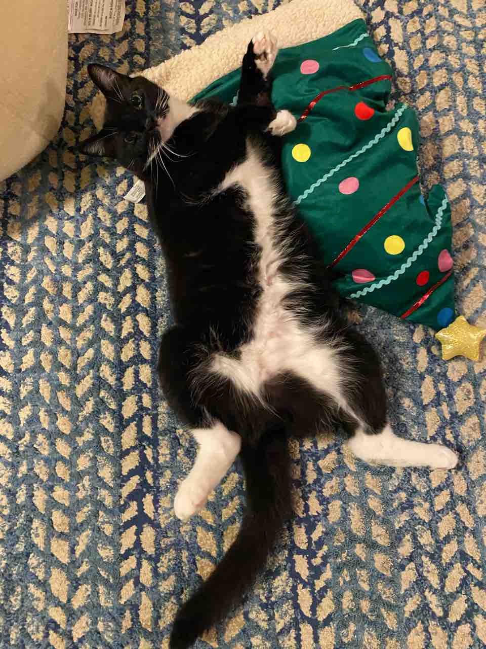 このカーペットにクッションと猫のおもちゃをばら撒いて