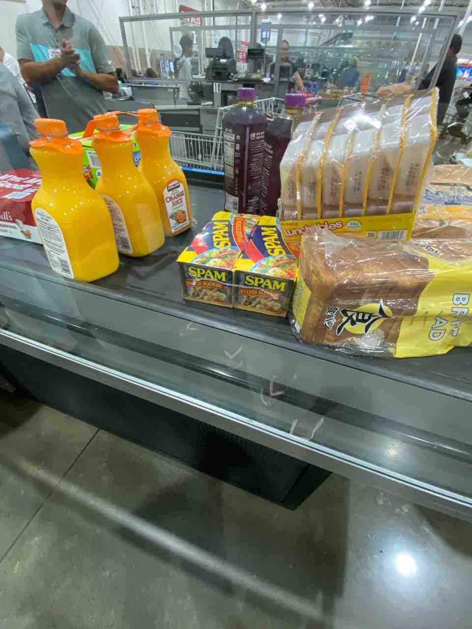 キャンベルのマッシュルームクリームの缶、アサイー、スパム、オレンジジュース、ジャパニーズ食パン。