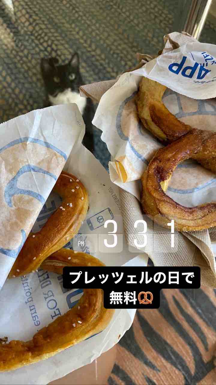 昨日はプレッツェルの日で無料プレッツェル。夫が持って帰ってきてくれたので、ありがたくいただく。