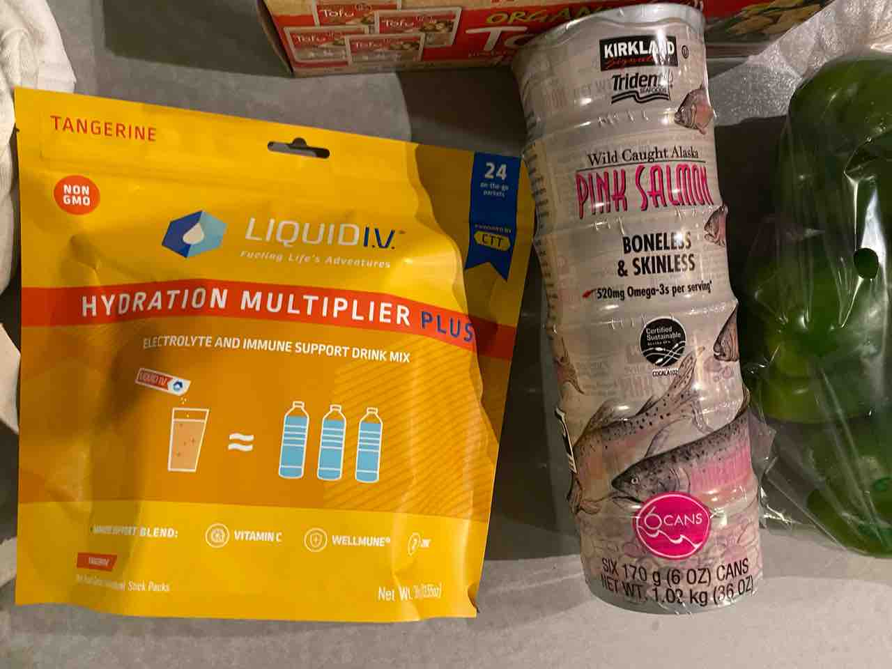 ポカリの粉みたいなやつと、ピンクサーモンの缶詰。