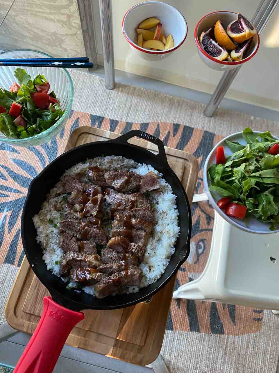 昨日も切ったらカツオのたたきみたいになってたのでフライパンに戻された肉達😂