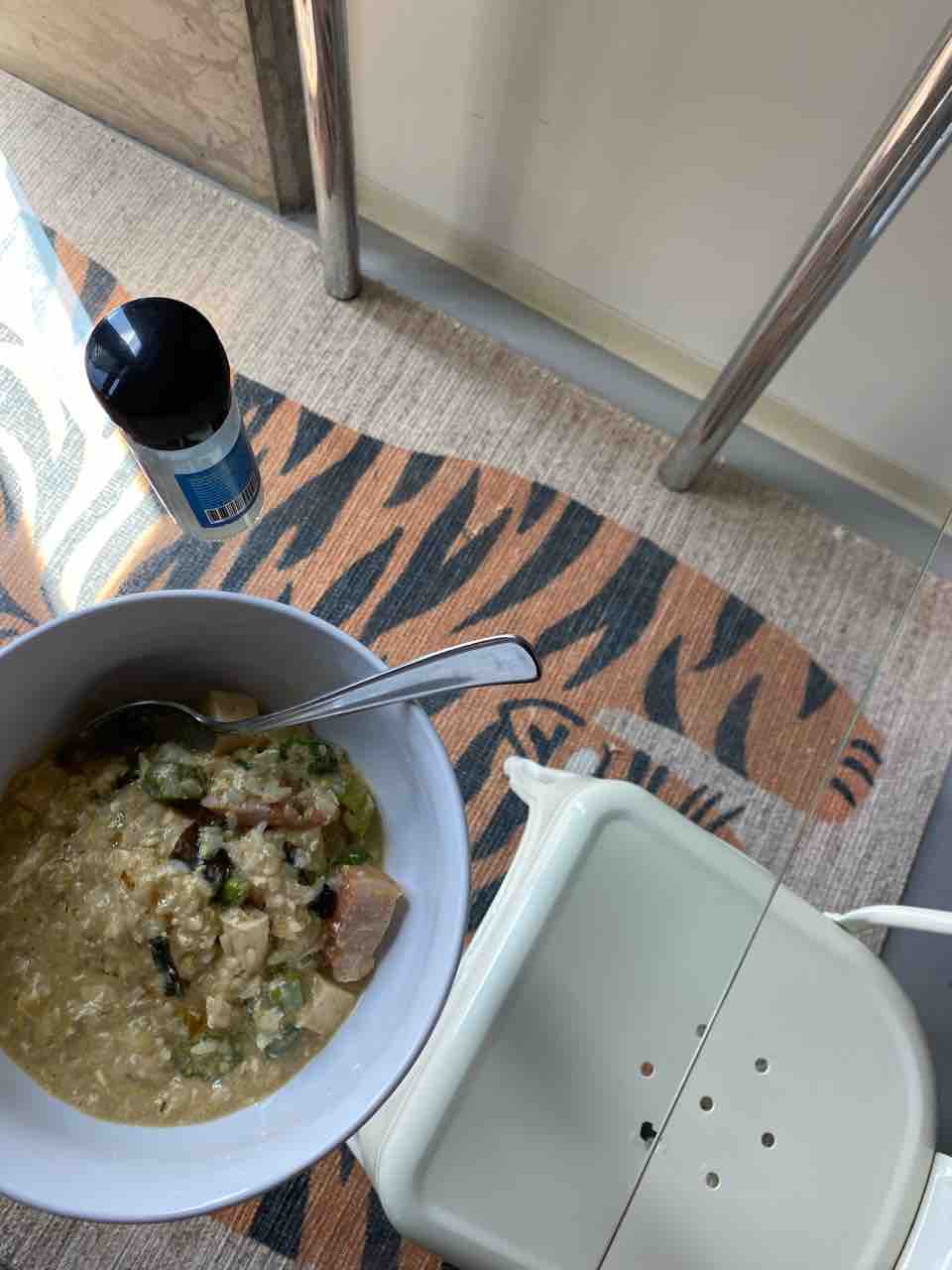 ランチは味噌汁に卵とベーコンの端っこ、オクラなど色々入れて雑炊に。