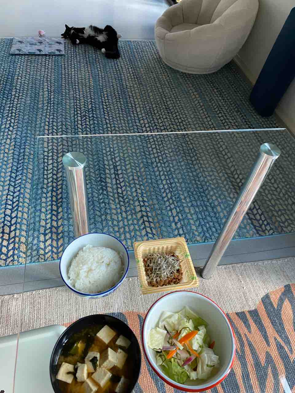 炊き立て白米、豆腐とわかめの味噌汁、納豆、茗荷と紫蘇入り浅漬け。
