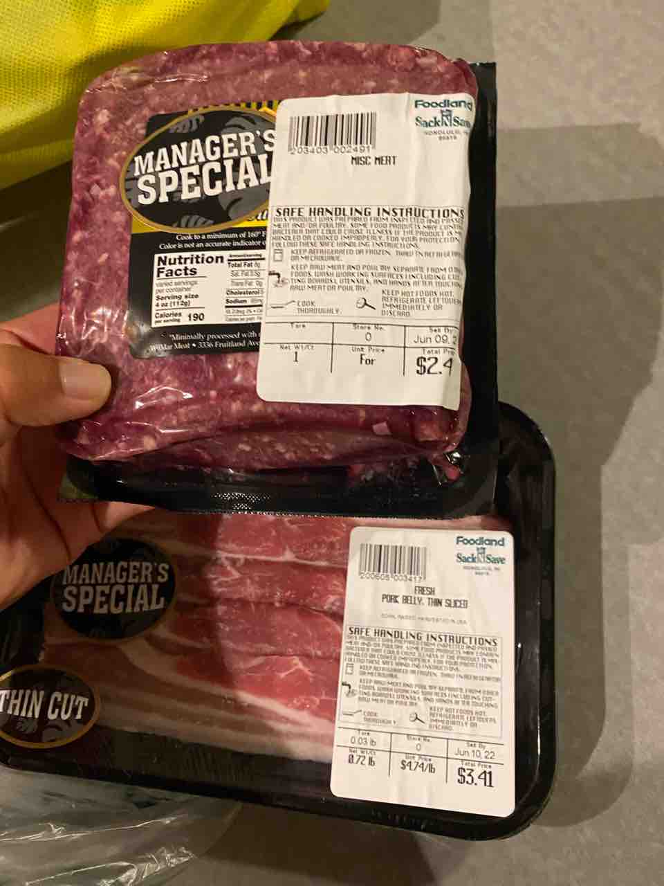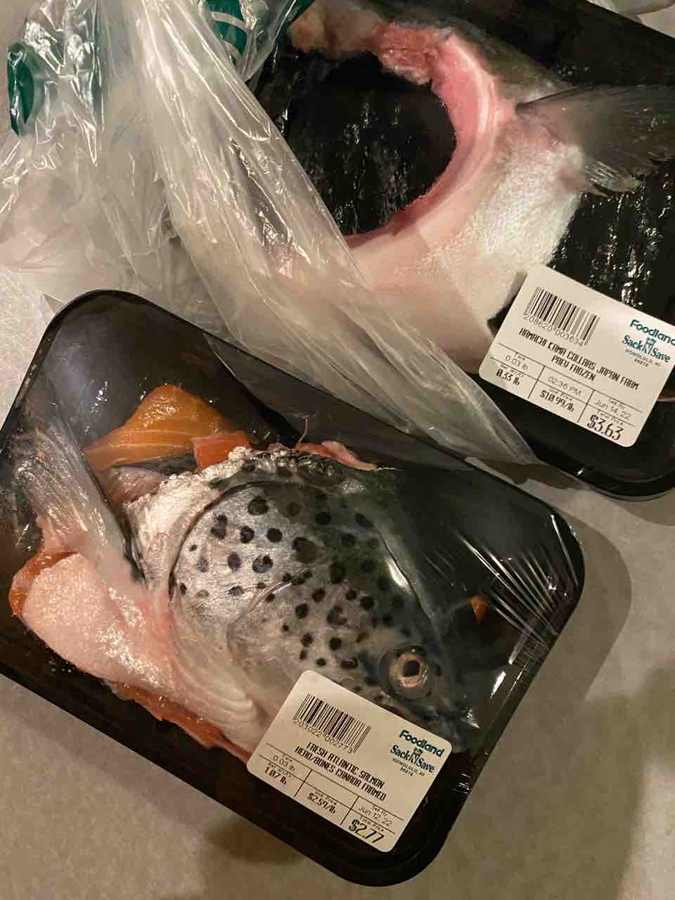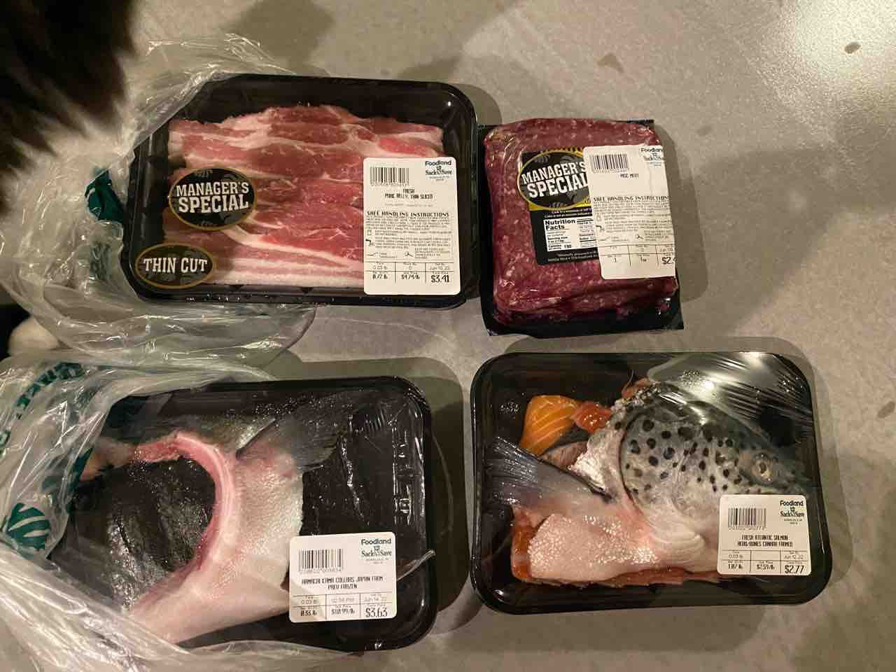 あとは値引きされたた肉や、サーモンとハマチのカマなど。