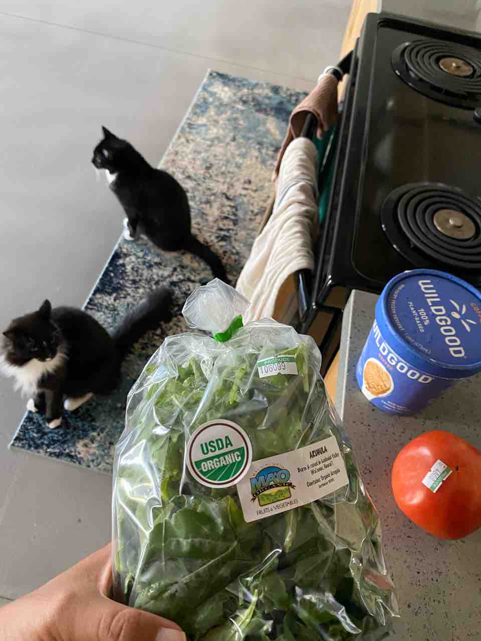 昨日買ってきたのは値上がりしたマオオーガニックファームのアルグラ(5ドル)、トマト、WILDGOODっていうオリーブオイルのアイス!