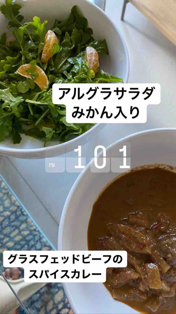 ランチはアルグラのサラダと、レフトオーバーのカレー。グラスフェッドビーフとスイカの白いところが入ってます。
