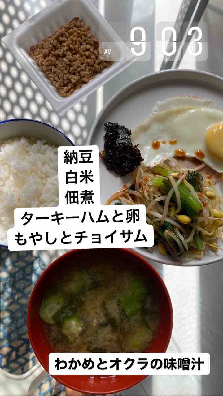 昆布と鰹出汁のお味噌汁に、白米、納豆、目玉焼き…