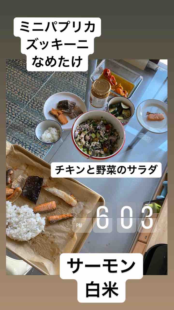 チキンと野菜のサラダ、サーモン、白米。