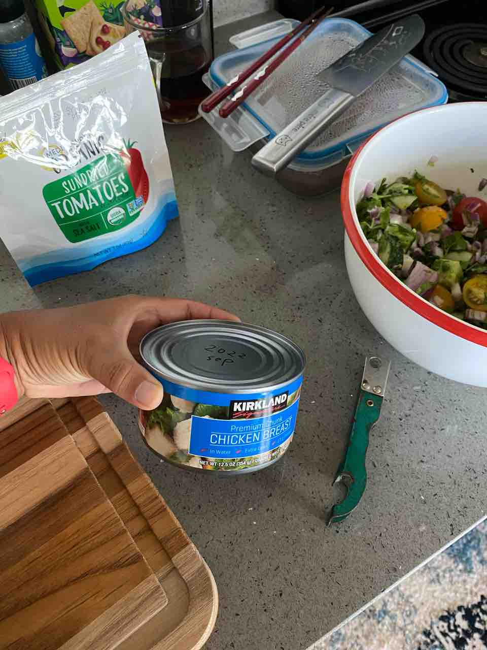 夜ご飯の野菜サラダにはチキンの缶詰を入れます!