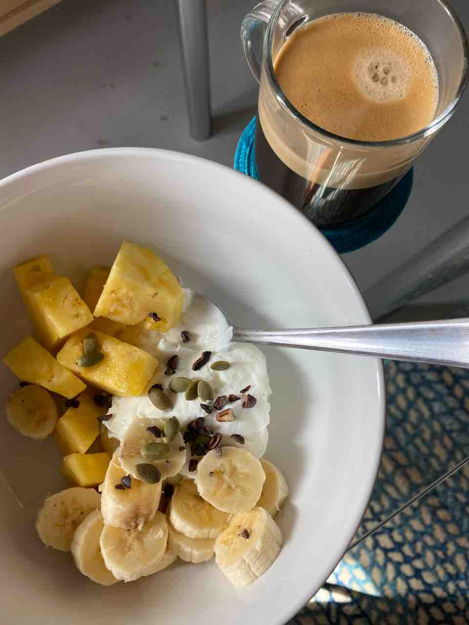 朝ごはんはギリシャヨーグルトと、パイナップル、バナナ〜!