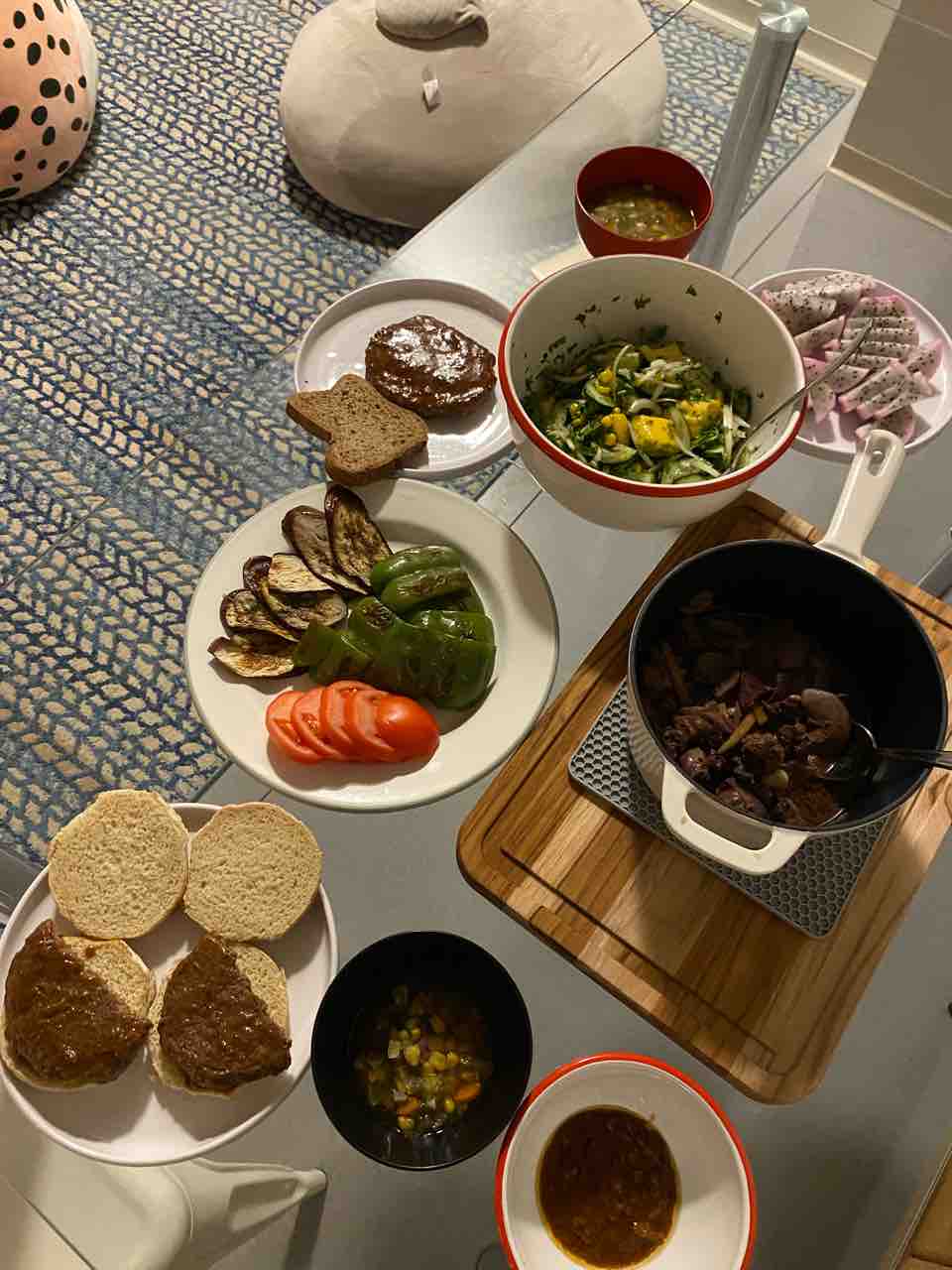 グラスフェッドビーフのバーガー、野菜スープ、野菜サラダ、焼き野菜、鶏レバー。