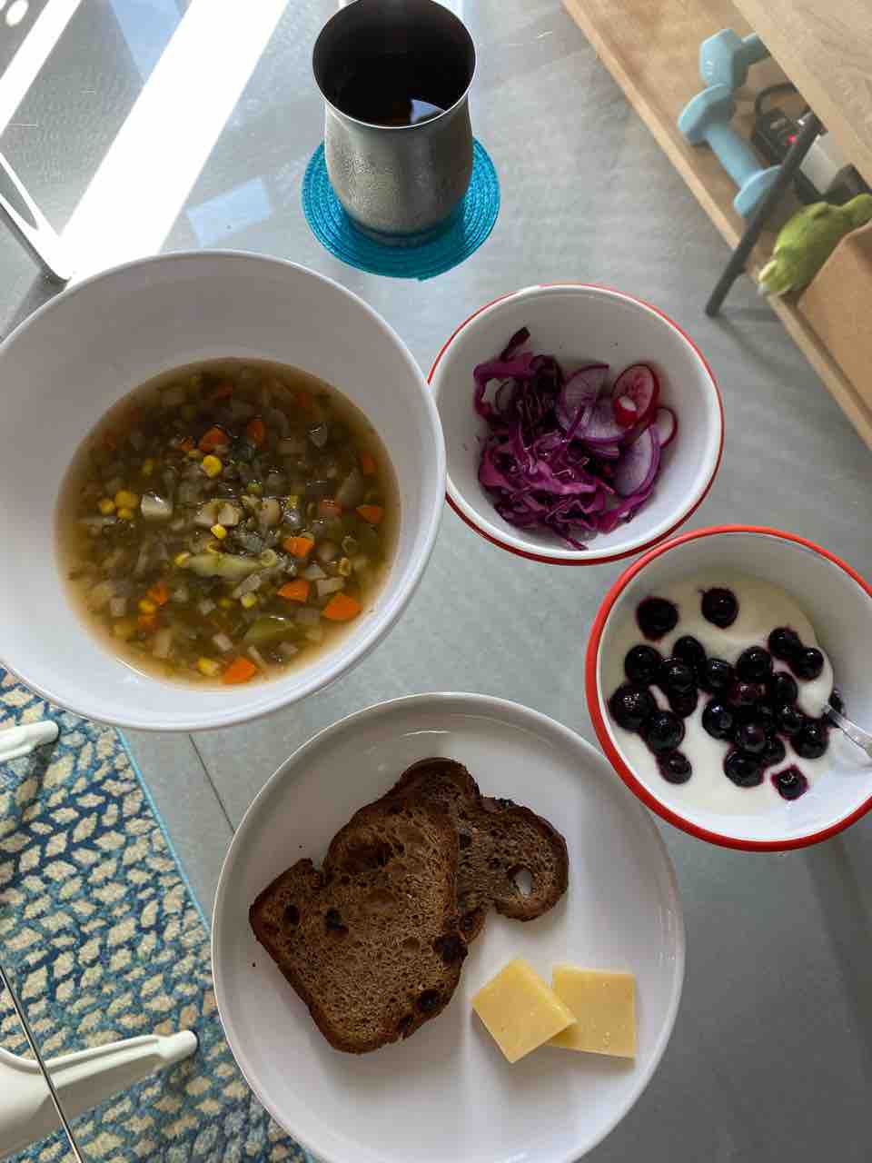 スープと、低糖質パン、チーズ、ヨーグルトとブルーベリー、紫キャベツ!