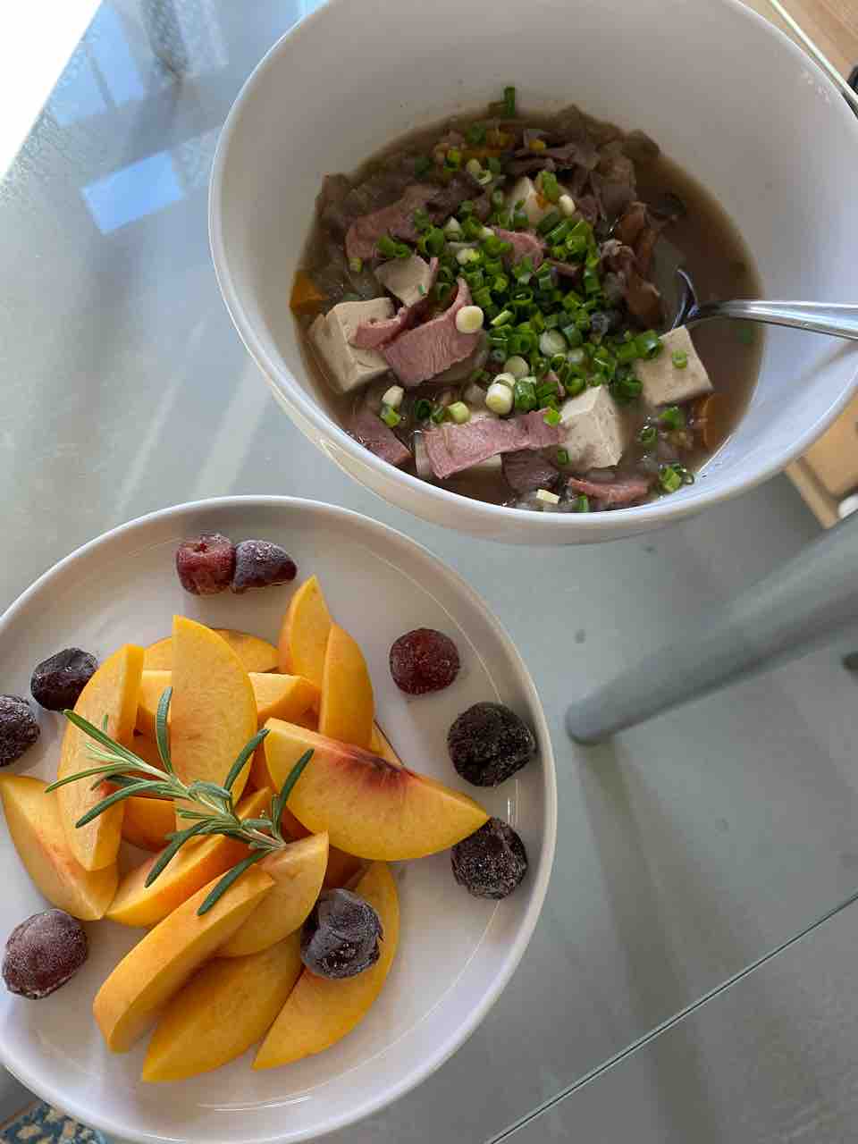 ターキーベーコンと豆腐入りの野菜スープに、桃とチェリー。