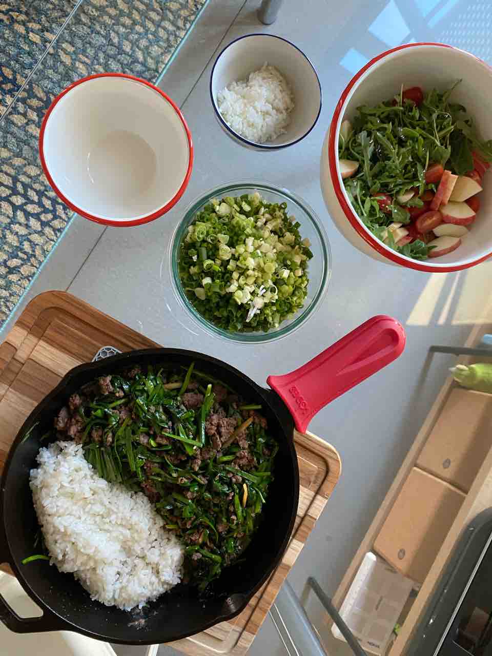 夫、米はスキレットからアツアツで食べるのが好きらしい。