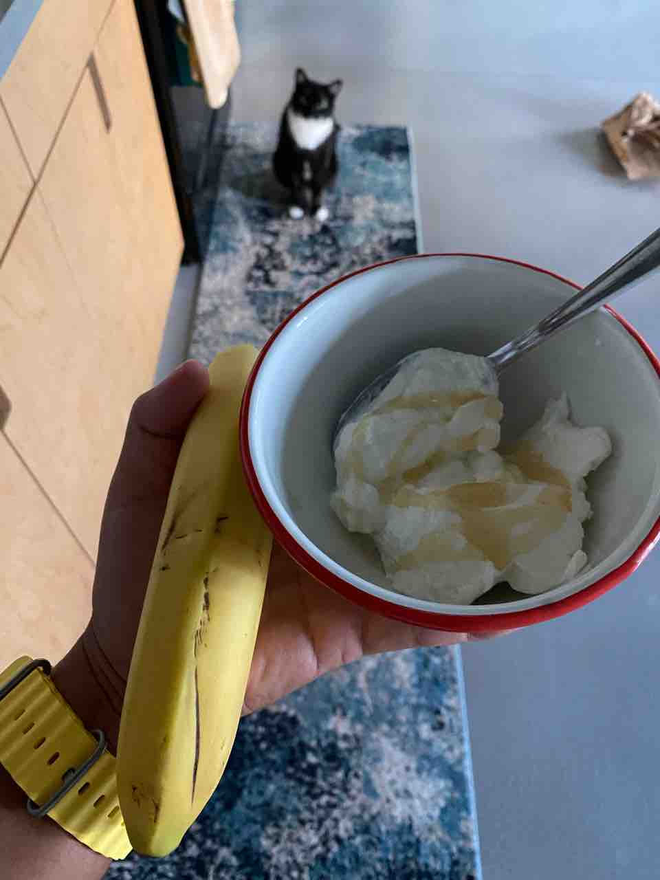 さて、それから生蜂蜜をかけたギリシャヨーグルトとバナナを食べて