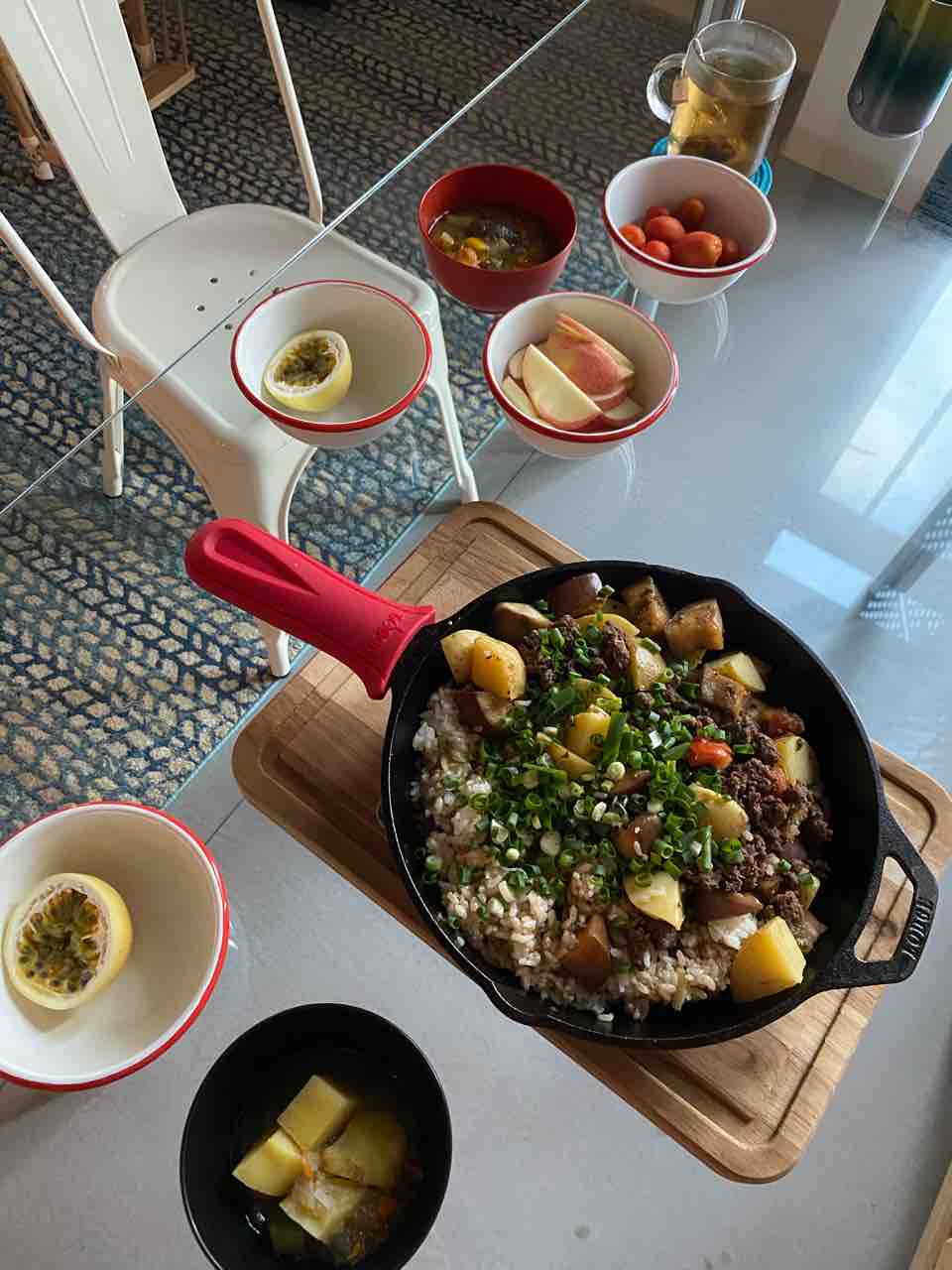 ディナーはグラスフェッドビーフとナスとトマトとジャガイモ炒め。