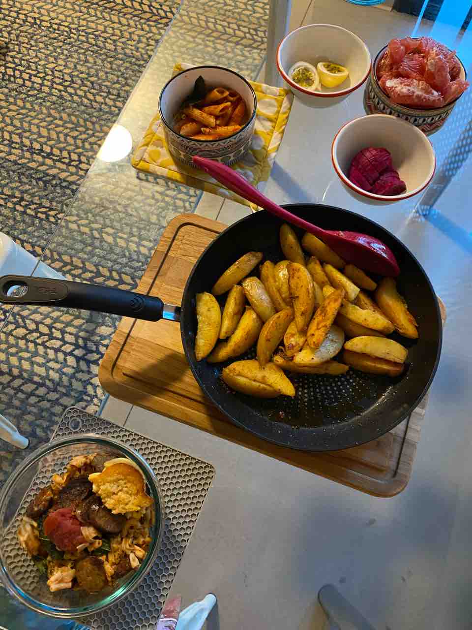 夜ご飯は色々とポットラックパーティーのレフトオーバーに、フルーツを。