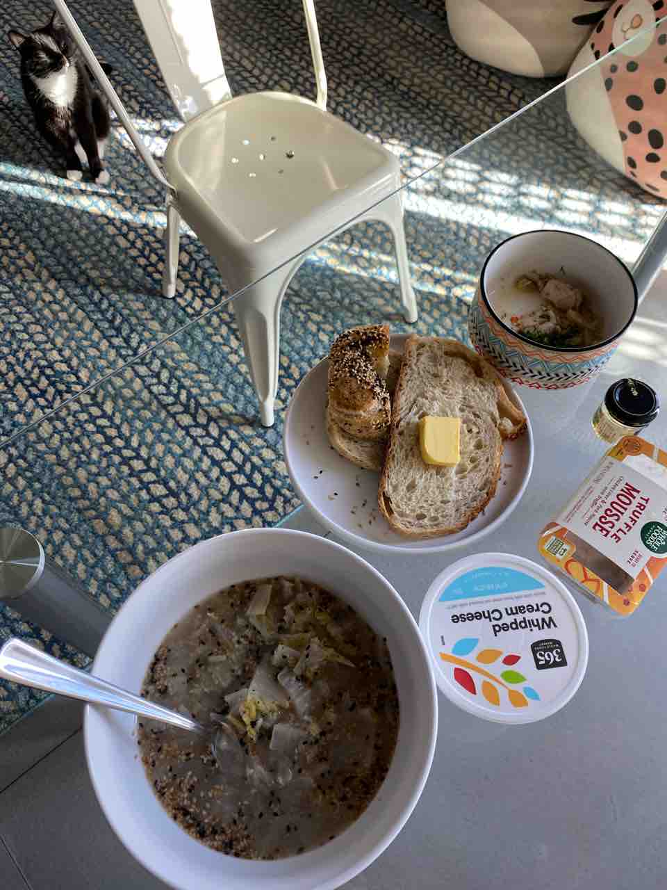 ベーグルのゴマが落ちまくりなのでスープの上で叩いてたら
