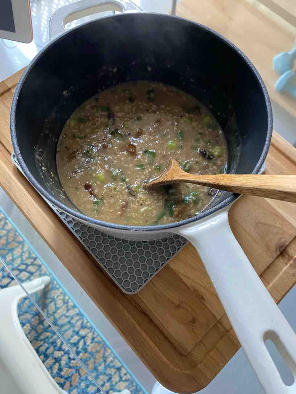 きのことグリーンオニオン、コラーゲンパウダー、粉チーズ。リゾットみたいで美味しい!