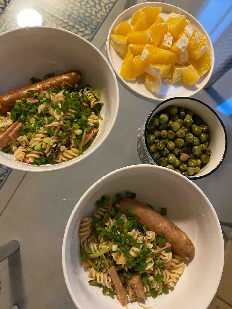 野菜たっぷりのグルテンフリーのライスパスタと、チキンソーセージ!