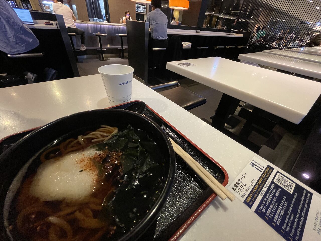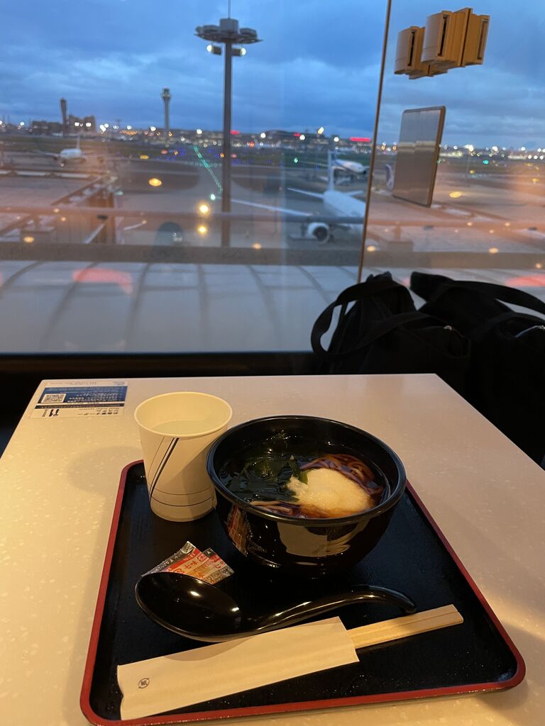 機内食も控えていたので、とろろわかめそばだけ頂きました。