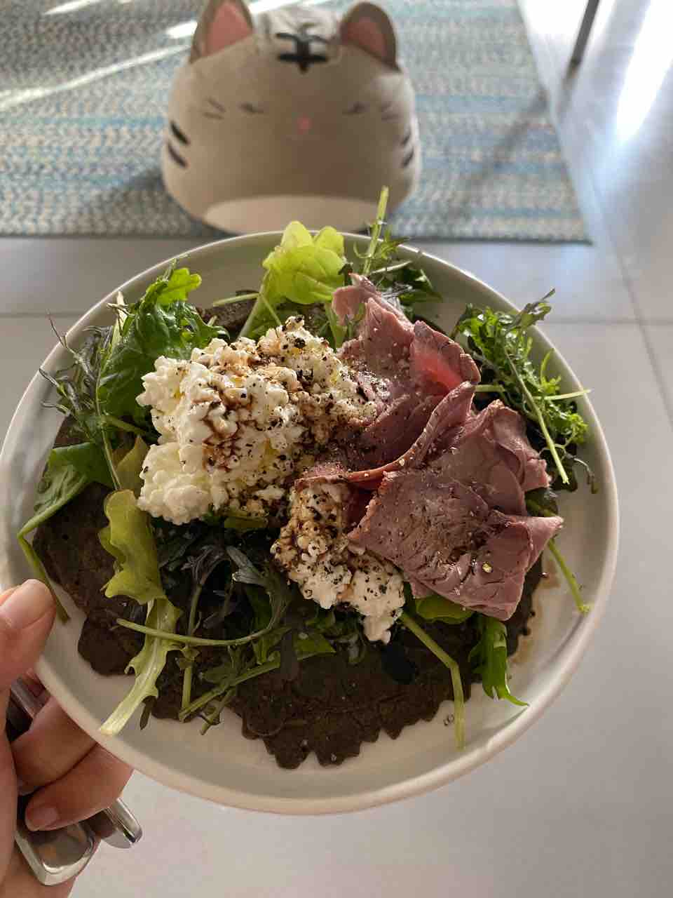 ハワイ産のグラスフェッドビーフのローストビーフ、パスチャーレイズドミルクのカッテージチーズ。