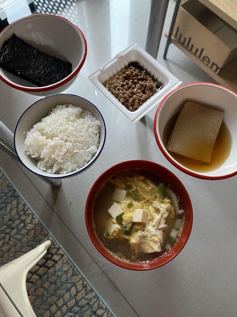 朝ごはんは、炊き立てご飯に、海苔、納豆とオリーブオイル、高野豆腐、豆腐と卵のチキンスープ。