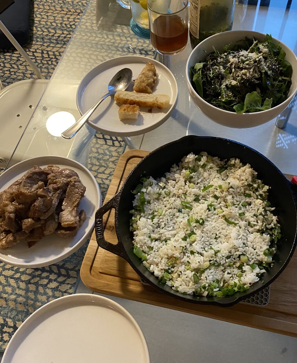ディナーは豚肉を焼いたやつと、そのフライパンにお米広げて石焼ビビンバ風にしたやつなど。