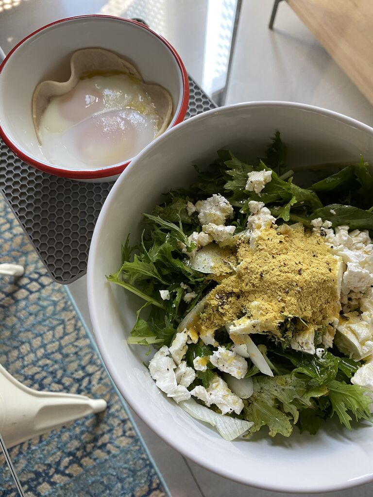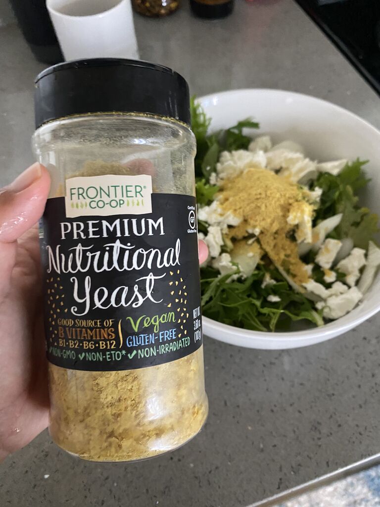 あとサラダにフェタチーズと、ニュートリショナルイースト、オリーブオイルとアップルサイダービネガー。