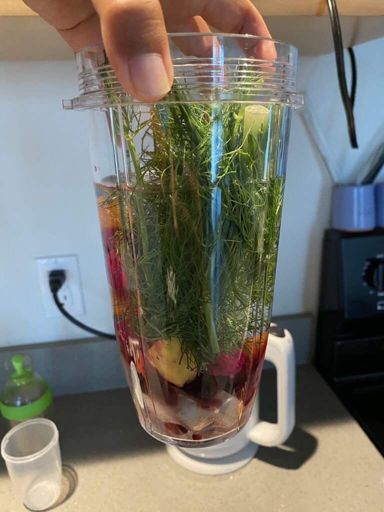 いろんな生野菜と果物の栄養がバッチリ取れる甘くないピリ辛なスムージー完成!