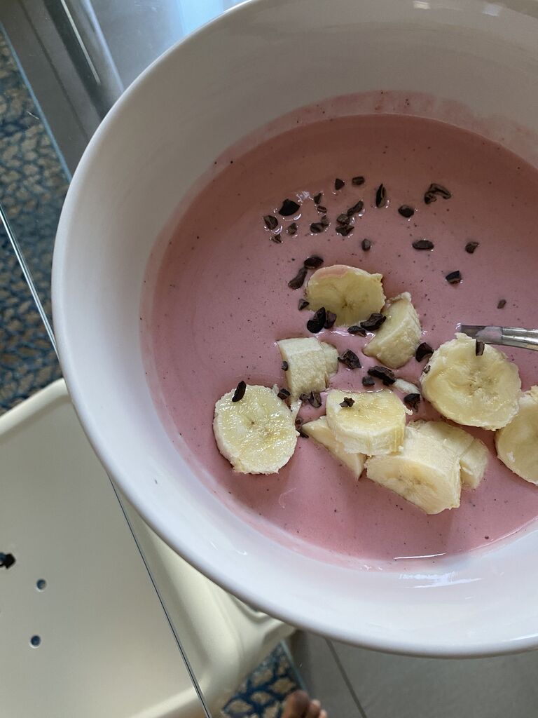 時間がなかったので適当にバナナとカカオニブを載せる。
