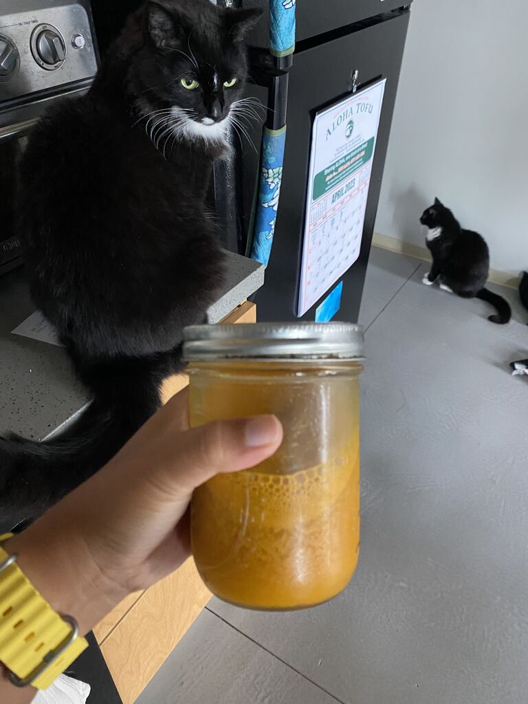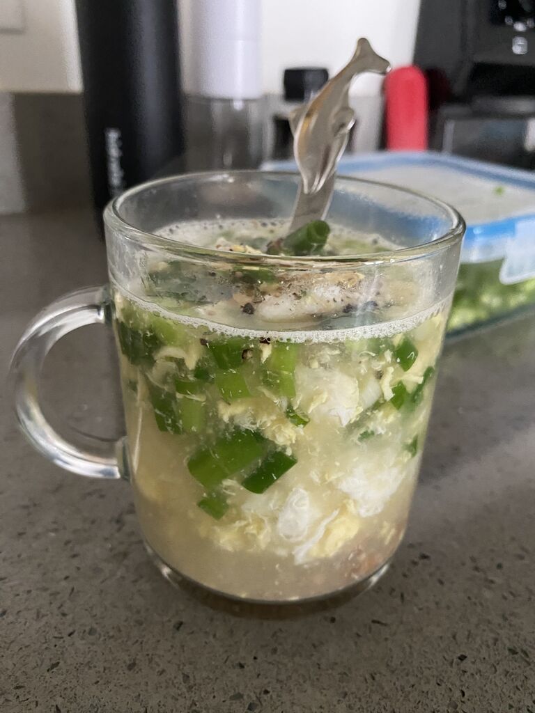 チキンストックに、鴨の卵でスープにして、ネギと納豆入れたやつ〜!