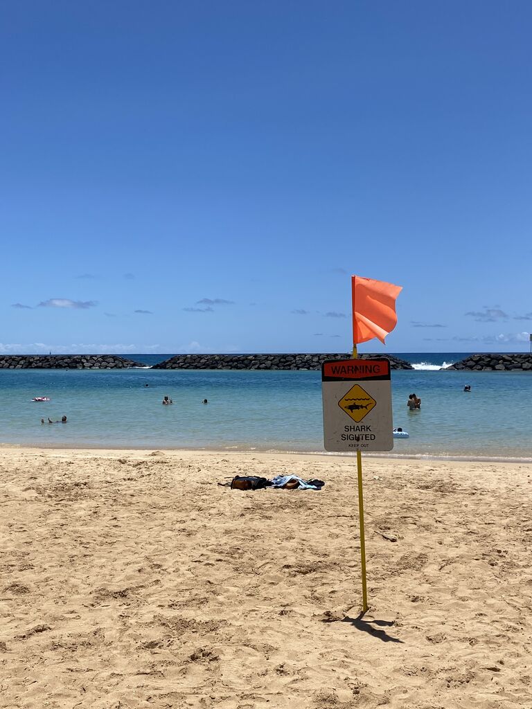 アラモアナに行ったら、赤い旗が出てたのでクラゲデーかな?って思ったらサメが出たよのサイン〜!