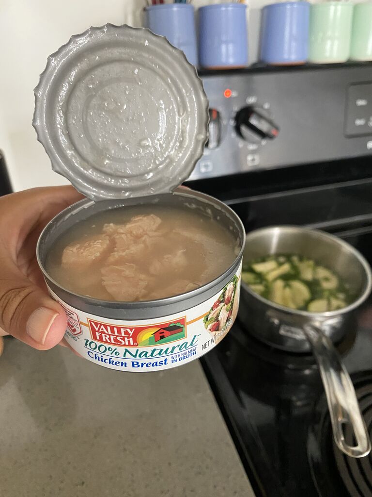チキンストックに、平飼い卵1個。チキンの缶詰半分。