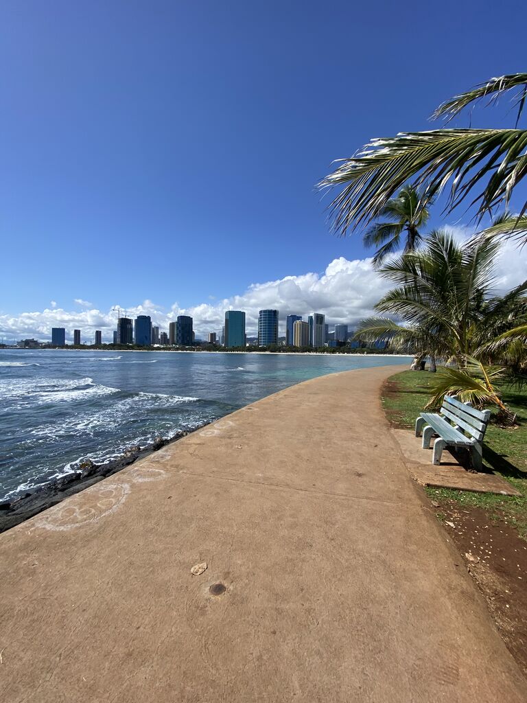 あのビーチの奥のビル群のあたりが私が住むカカアコです。